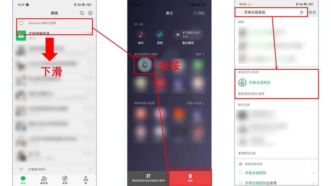 如果发现小程序未成功更新,请长按删除小程序,重新搜索"济南北城医院"小程序使用即可,操作步骤如下: